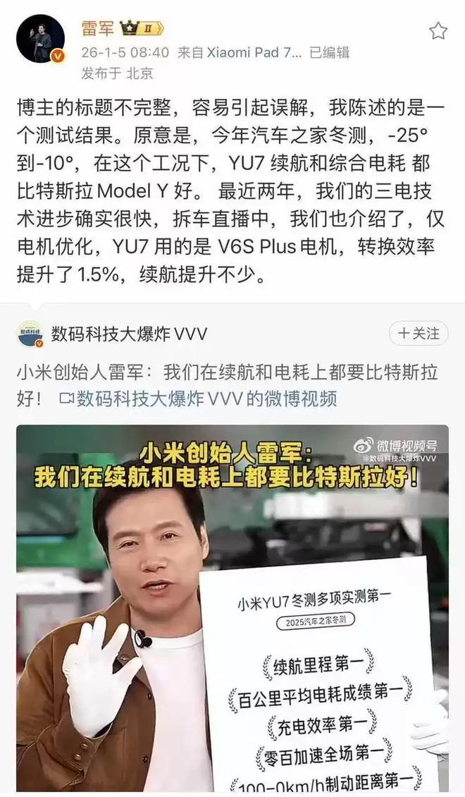 另据报道,1月5日,雷军转发某博主标题为“小米创始人雷军:我们在续航和电耗上都要比特斯拉好!”的视频,并解释称:“博主的标题不完整,容易引起误解,我陈述的是一个测试结果”。