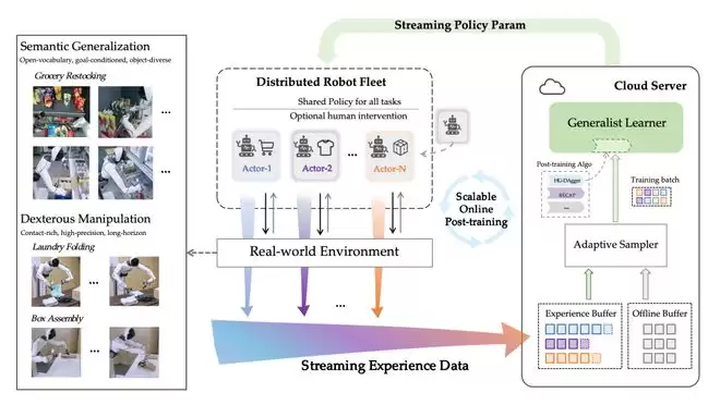 多台部署了同一 policy 模型的机器人(actors)在不同地点同时执行多样任务,持续采集成功、失败以及人类接管产生的交互数据。每台机器人的经验数据被汇总传输至云端 Experience Buffer 中。