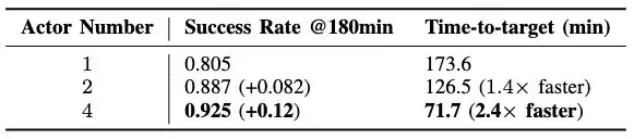 我们使用了三种机器人队伍数量(单机、双机、四机配置),在同样的数据传送总量的基础上,进行了比较。实验结果表明,在相同的总训练时间下,更多数量的机器人带来了更高的性能表现。在总训练时间为 3 小时的限制下,四机进行学习的最终成功率达到了 92.5%,比单机高出 12%。我们认为,多机采集可以有效阻止模型过拟合到单机的特定特征上。同时,SOP 还将硬件的扩展转化为了学习时长的大幅缩短,四机器人集群相比单机能够将模型达到目标性能的训练速度增至 2.4 倍。