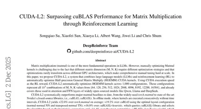 这项由DeepReinforce团队完成的突破性研究发表于2025年12月,研究编号为arXiv:2512.02551v1。论文的主要作者包括苏松桥、孙晓飞、李小雅、王阿尔伯特、李机伟和沈克里斯等研究人员。这项研究首次证明了人工智能可以在矩阵计算这一GPU最核心的操作上超越英伟达最新优化库,对整个人工智能和高性能计算领域具有重大意义。