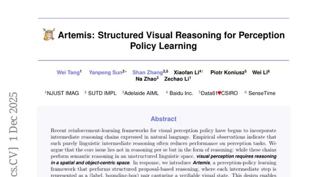 这项由南洋理工大学、南京理工大学、阿德莱德大学、百度、CSIRO以及商汤科技等多家知名机构合作的研究发表于2024年12月,研究团队包括唐伟、孙彦鹏、张珊、李晓凡等众多学者。有兴趣深入了解的读者可以通过论文编号arXiv:2512.01988v1查询完整论文。这项名为"Artemis"的研究彻底颠覆了当前AI视觉理解的方式,让机器真正学会了"用眼睛思考"。