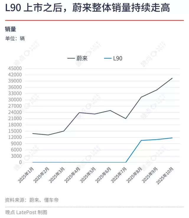 凭借极高的性价比,L90 成功一个短暂的市场空档 —— 30 万元以内的纯电大六座 SUV。它首个完整交付月数量即破万,占同期蔚来销量近三分之一,托住了急坠中的蔚来。