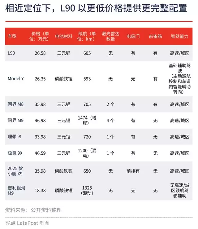 L90 上市后,2025 年下半年国内密集上市了一大批 “5326”SUV(即车长 5 米,轴距 3 米、车宽 2 米以上的六座及以上大型 SUV),包括但不限于:吉利 M9、蔚来 ES8、腾势 N9、领克 009、深蓝 S09、问界 M9/M8、理想 i8、岚图 “泰山”、极氪 9X 等。