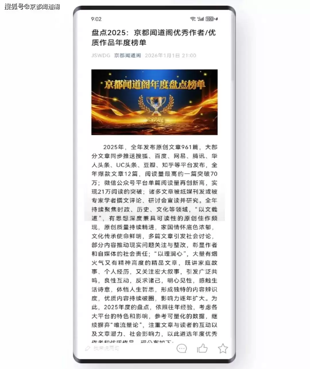“京都闻道阁”平台近年来专注深耕内容创作领域,通过年度综合评估机制遴选优秀作者与作品,在行业中的影响力与日俱增。数据显示,该平台2024年全年发布原创文章691篇,到2025年已增至961篇,同步推动分发渠道从搜狐、百度等主流平台扩展至华人头条、豆瓣等新兴媒体,构建起多维传播矩阵。