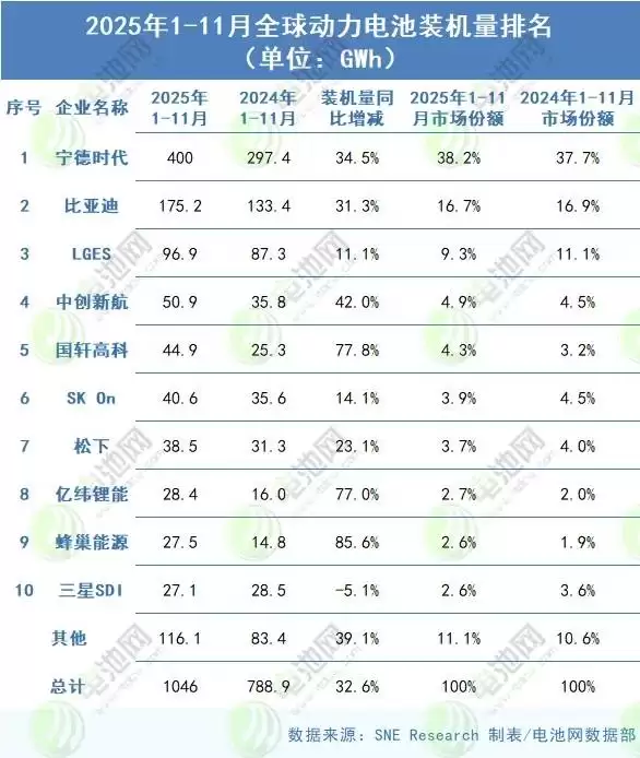 蜂巢能源2025年前11月全球装机量跃居前九,增速领先