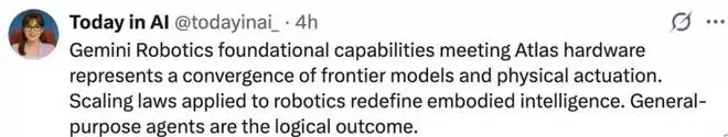 Today in AI 则认为,Gemini Robotics 的基础能力与 Atlas 硬件相结合,代表了前沿模型与物理驱动的融合,应用于机器人的 Scaling Laws 重新定义了具身智能,通用智能体是合乎逻辑的结果。
