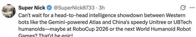 一位名为 Super Nick 的网友称,太期待看到一场真正的「智能正面对决」了:一边是像 Gemini 驱动的 Atlas 这样的西方机器人,另一边是中国阵营里动作迅猛的宇树或优必选人形机器人。也许就在 RoboCup 2026,或者下一届世界人形机器人运动会上,这一切就会发生,那一定会非常震撼。