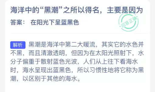 海洋中的“黑潮”之所以得名,主要是因为它在阳光照射下呈现出蓝黑色。这种现象与我们的日常观察有所不同,背后隐藏着光的散射原理。2026年1月6日,神奇海洋的新题目已经揭晓,正确答案也随之公布。点击领取拼图,一起为修复海洋生态贡献力量!今天的正确答案是:【在阳光下呈蓝黑色】。