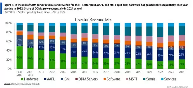 美银美林总结道,硬件支出在IT行业的收入占比自2024年以来逐年上升,行业正在进入一个“硬件复兴时代”。在这个周期中,不仅是提供算力的英伟达,提供“记忆”的存储厂商,以及提供连接的安费诺(Amphenol)和康宁(Corning),都将成为AI推理浪潮中的核心受益者。