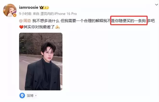 后面这姐姐还发疯的骂了周奇,说她需要一个合理的解释,称自己不是对方买的一条狗,还说周奇对自己最差。