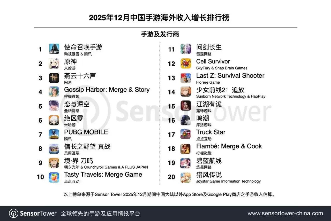 1月7日消息,Sensor Tower商店情报平台公布最新数据,展示了2025年12月中国手游产品在海外市场的收入及下载量排行榜单,详细榜单变化如下。
