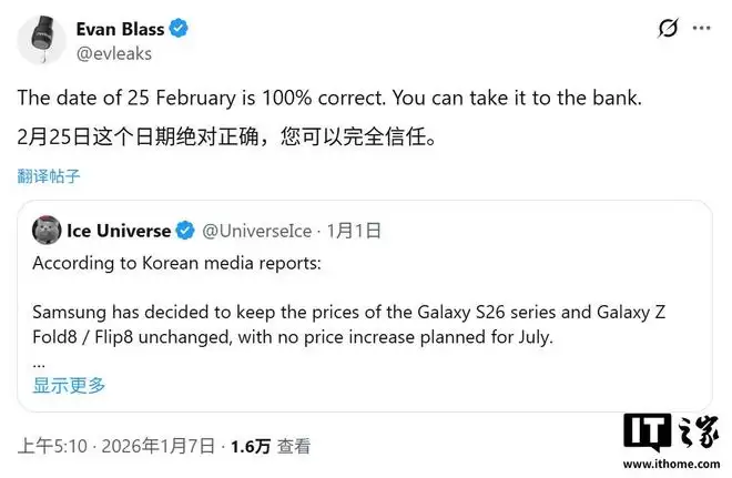 IT之家1月7日消息,爆料源@Evleaks今天(1月7日)发布推文称,三星计划于2026年2月25日在美国旧金山举办Galaxy Unpacked新品发布会,届时将正式推出Galaxy S26系列智能手机。