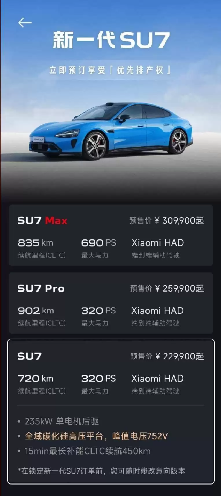 小米SU7价格揭晓:22.99万元起接受预订