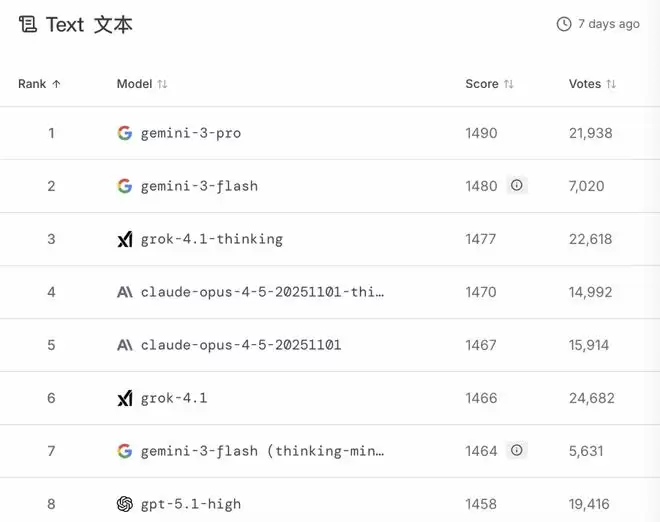 7天前的总分榜单,Gemini-3-pro稳居榜首