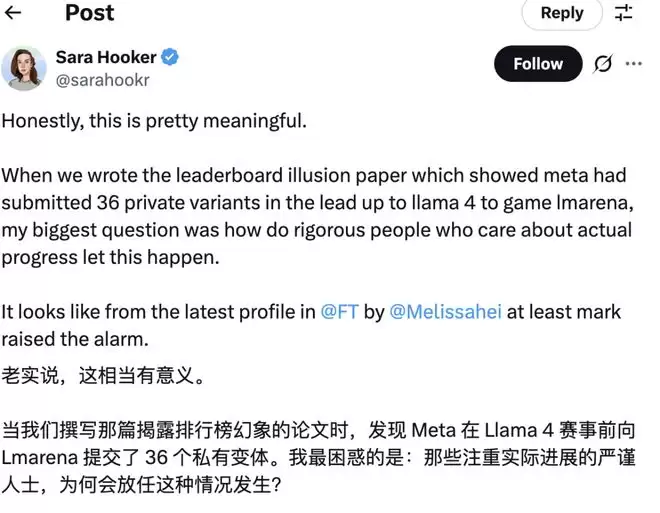 2025年,一篇论文直接曝出黑幕:Meta在Llama 4发布前,偷偷提交了36个私有变体模型,反复测试「刷分」,成功gaming 排行榜。