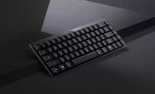 ProArt KD300键盘采用了紧凑型的65%配列设计,移除了Fn功能区,机身高度仅26.8mm。键盘内置双层声学阻尼结构,配备RX光学矮轴,提供线性手感体验,触发键程为1.0mm,触发力度在40至55gf之间,键盘后部还设有一块触控面板。