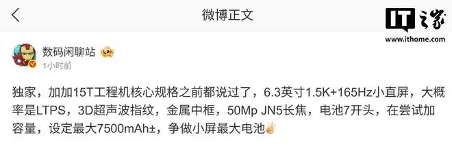 来自 IT之家 1 月 7 日的消息,博主 @数码闲聊站 今日在微博透露,某厂商的 15T 工程机计划配备一块 6.3 英寸的 1.5K 分辨率、165Hz 刷新率的小尺寸直屏。