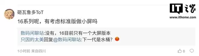 随后,有用户在评论区询问:“请问这款手机的发布时间大概是几月?” 博主回复道:“大概在 4 月前后。” 另一名用户则追问:“会是 16 系列吗?有没有考虑将标准版做成小屏?” 对此博主回复:“没有,16 系列目前只有一个大屏版本。”