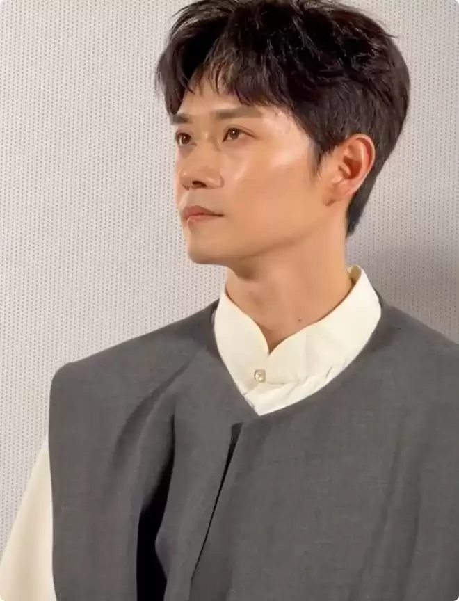 利落的短发,配上温和的笑容,让人瞬间梦回当年的沉香,虽然岁月在他脸上留下了些许痕迹,却也让他多了几分成熟男性的魅力。