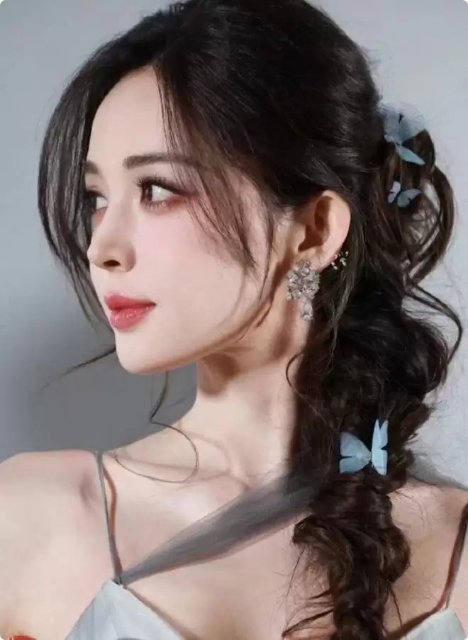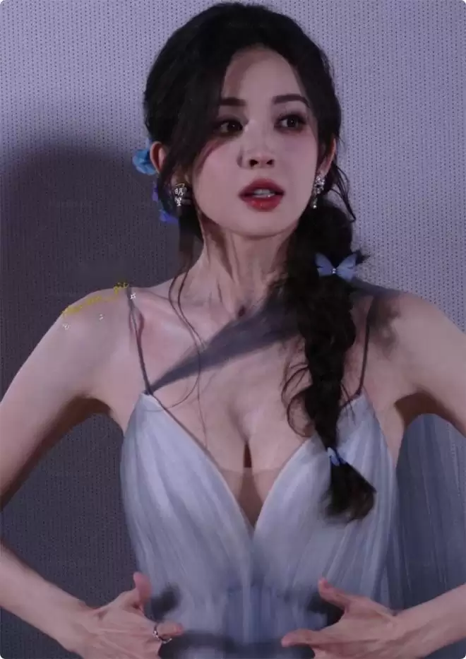 一袭蓝色深V薄纱长裙,将她的好身材勾勒得恰到好处,层叠的纱幔随风飘动,配上精致的妆容和盘发,活脱脱一个从画里走出来的江南贵女。