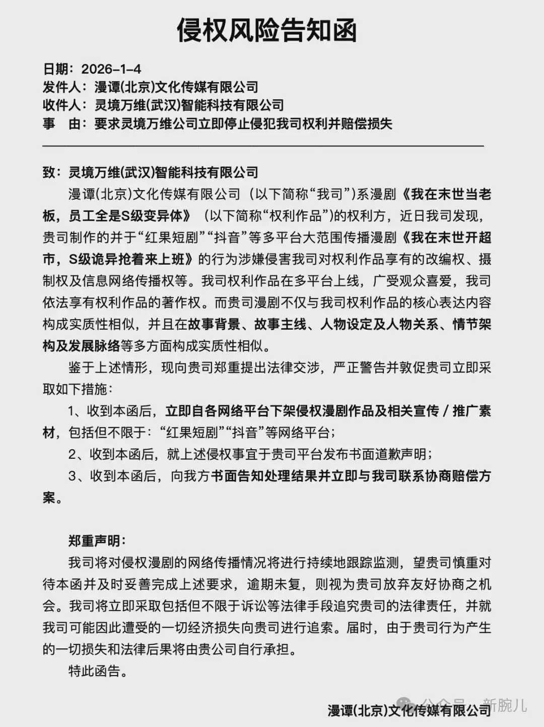 1月4日,漫画堂向灵境万维出示一则侵权风险告知函,内容为漫画堂“要求灵境万维公司立即停止侵犯我司权利并赔偿损失”。