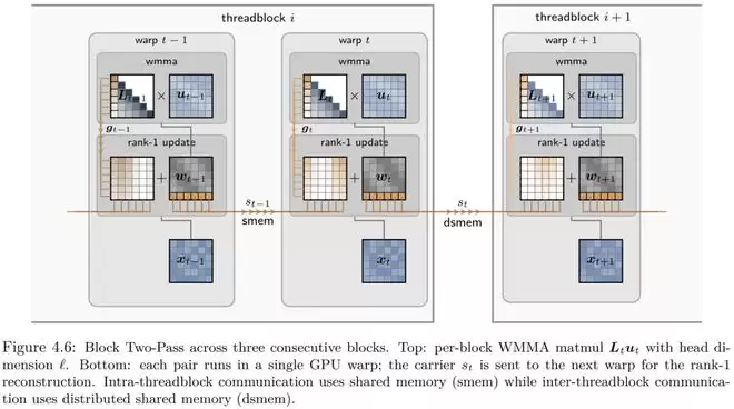 在第二阶段,算法通过 GPU 片上的共享内存(SMEM)或分布式共享内存(DSMEM)在相邻块之间传递状态载体,并进行即时的秩-1 补偿。