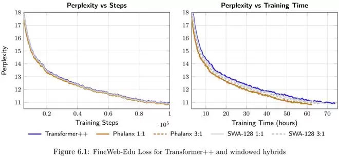 在模型精度方面,实验数据显示 Phalanx 在匹配 Transformer++ 基准性能的同时,甚至在特定比例下取得了更低的困惑度。