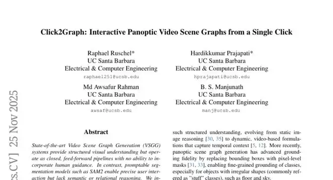 A:Click2Graph是由加州大学圣巴巴拉分校开发的首个用户引导的全景视频场景图生成系统。它的核心能力是仅通过用户的一次点击,就能自动识别并追踪指定对象,发现与其互动的其他物体,并预测它们之间的具体关系,形成完整的场景关系图谱。