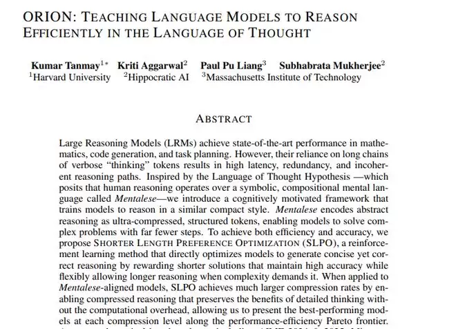 来自哈佛大学、加州理工学院MIT和Hippocratic AI的研究团队在2025年11月发表了一项突破性成果,论文题目为"ORION: Teaching Language Models to Reason Efficiently in the Language of Thought"。这项研究发表在顶级会议的评审中,感兴趣的读者可以通过论文编号arXiv:2511.22891v1查询完整内容。