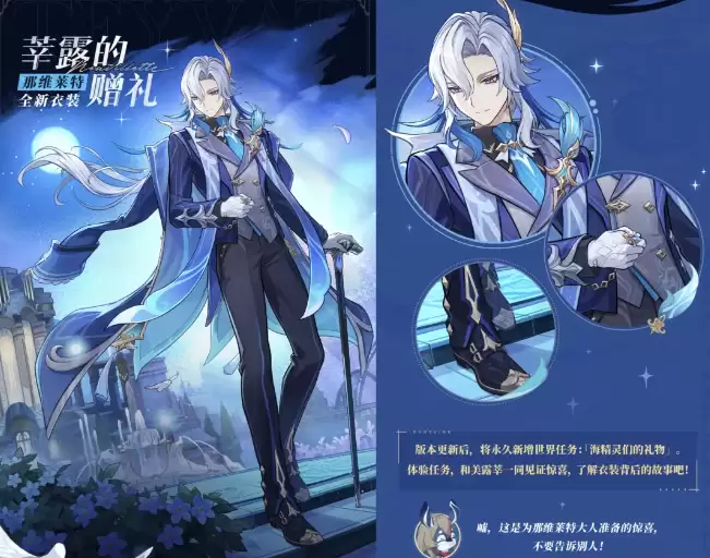 2、「月之四」版本更新后,那维莱特衣装【蒟露的赠礼】永久上架商城。