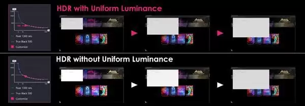 同时,显示器还配备了微星最新的均匀辉度显示技术,允许用户自定义HDR亮度曲线。该技术通过将特定亮度水平与不同显示窗口大小相关联,确保在各种使用场景下都能提供稳定流畅的亮度体验。