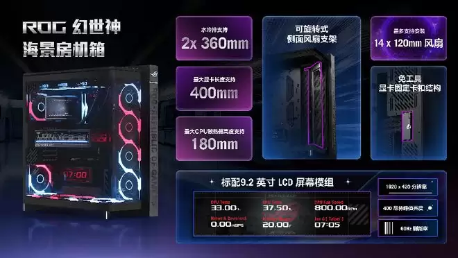 同时,ROG还推出了首款“海景房”机箱 —— 幻世神,自带9.2英寸LCD屏并支持免工具显卡固定卡扣,而且侧面和底部都支持最多4个散热风扇的安装,在背部的下侧还设计了单独的散热风扇,辅助排出显卡的废气。