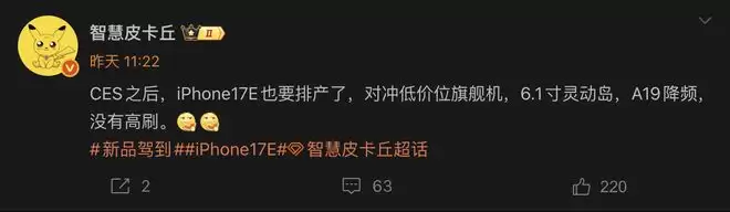 这则消息源自博主智慧皮卡丘的最新贴文,虽然他没有直接点名具体型号,但从描述的硬件配置来看,基本可以确定指的就是iPhone 17e。