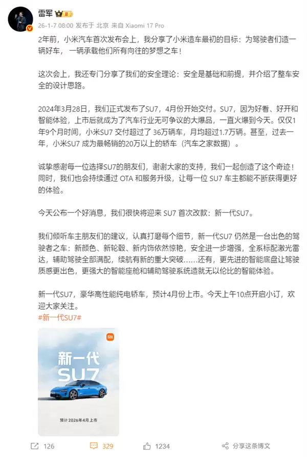 小米SU7全新升级,雷军官宣感恩用户支持