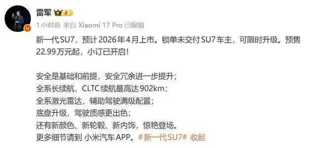 小米汽车近日正式宣布,全新一代SU7开启小订通道,推出标准版、Pro版和Max版三款车型,预售价分别为22.99万元、25.99万元和30.99万元。对比现有车型,标准版与Pro版价格上调1.4万元,Max版价格增加1万元。据小米集团董事长雷军透露,新一代SU7预计将于2026年4月正式投放市场,已锁定订单但尚未完成交付的现有SU7车主可享受限时升级服务。