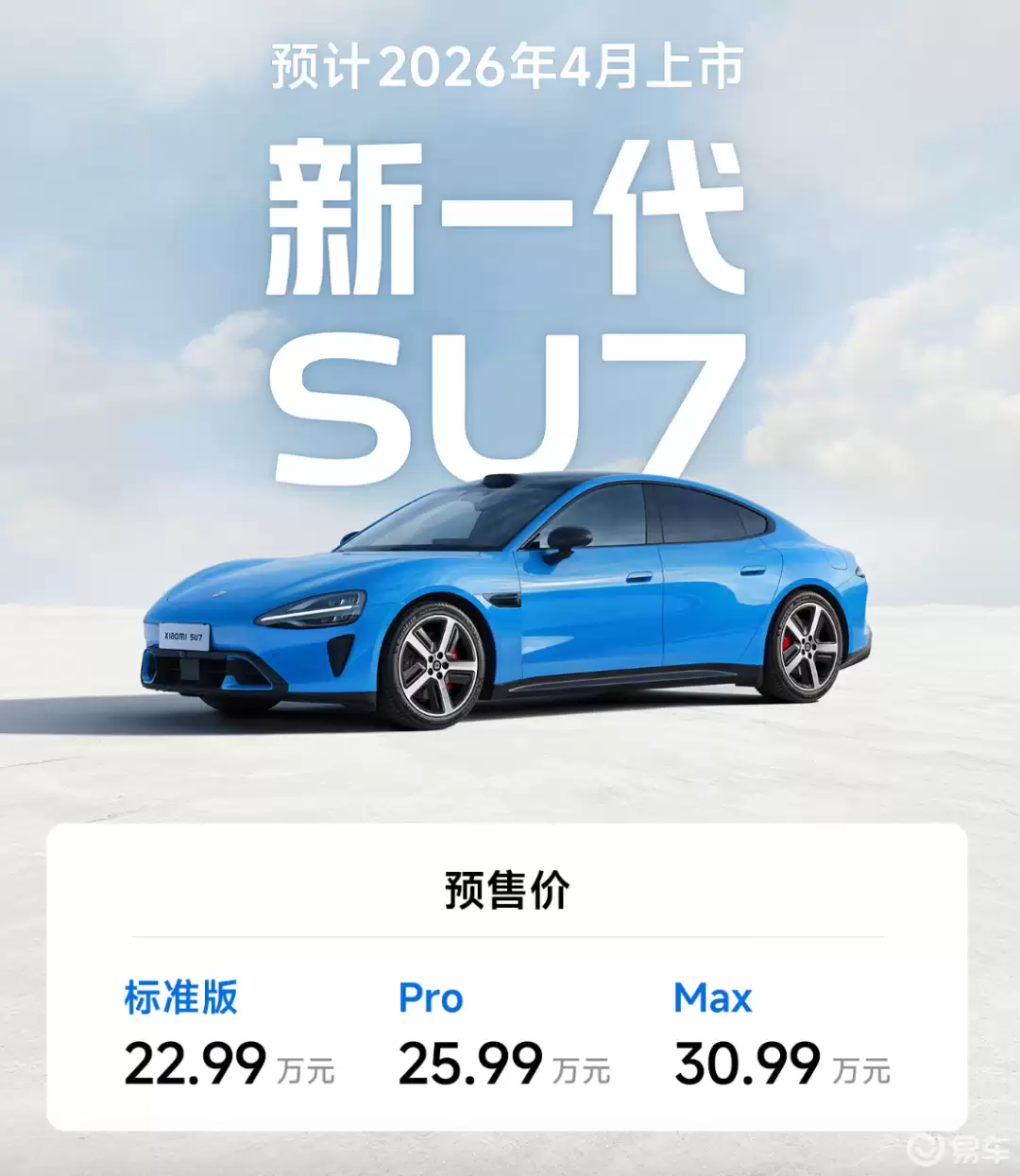 新一代小米SU7即将于今年4月正式登场,目前小订渠道已经开启。此次推出标准版、Pro版、Max版三个版本,预售价分别为22.99万元、25.99万元、30.99万元。与现款21.59万元 - 29.99万元的售价区间相比,新一代起步预售价增加了1.4万元。不过按照汽车行业惯例,正式上市时售价或许会有所下调,但考虑到新一代车型在配置上进行了大幅升级,价格大幅降低的可能性较小,至少不会比现款价格更低,且吸引力显著提升。