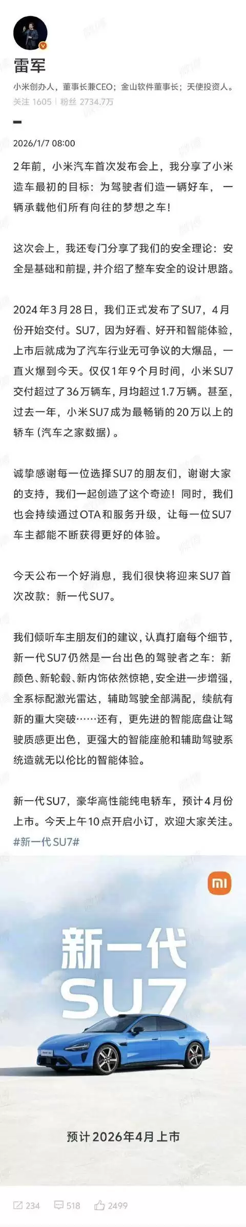 小米集团董事长雷军在其个人微博平台正式宣布,旗下豪华高性能纯电轿车SU7即将迎来重要版本更新。这款被誉为"驾驶者之车"的明星产品,将在保持卓越性能优势的基础上,通过多项技术创新实现全方位进化。