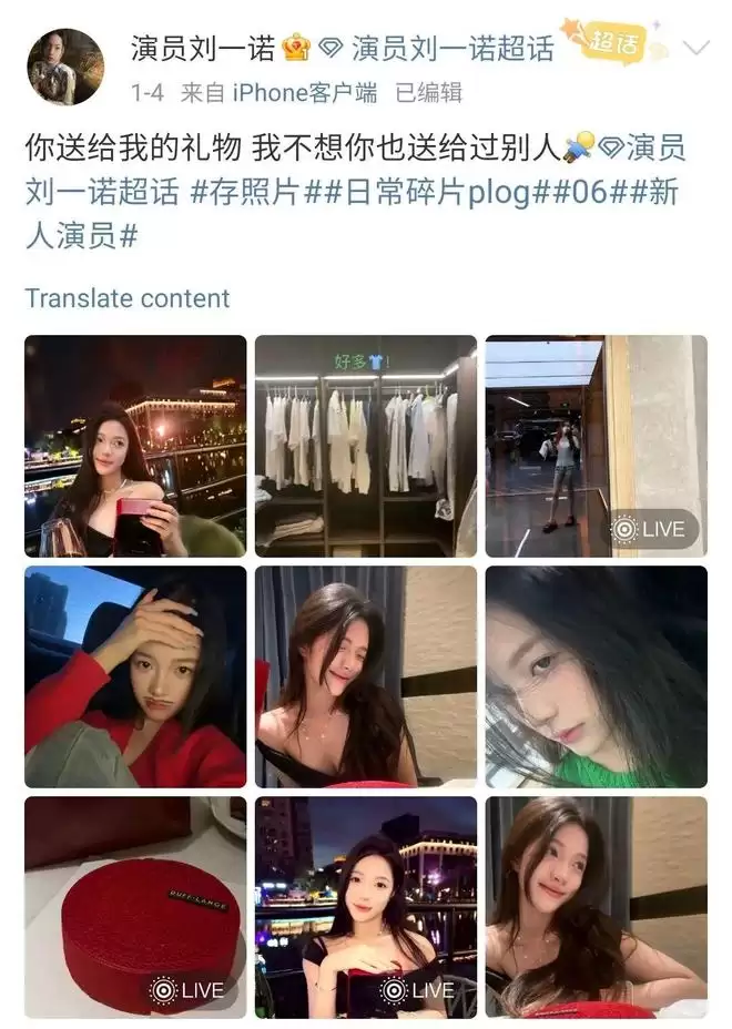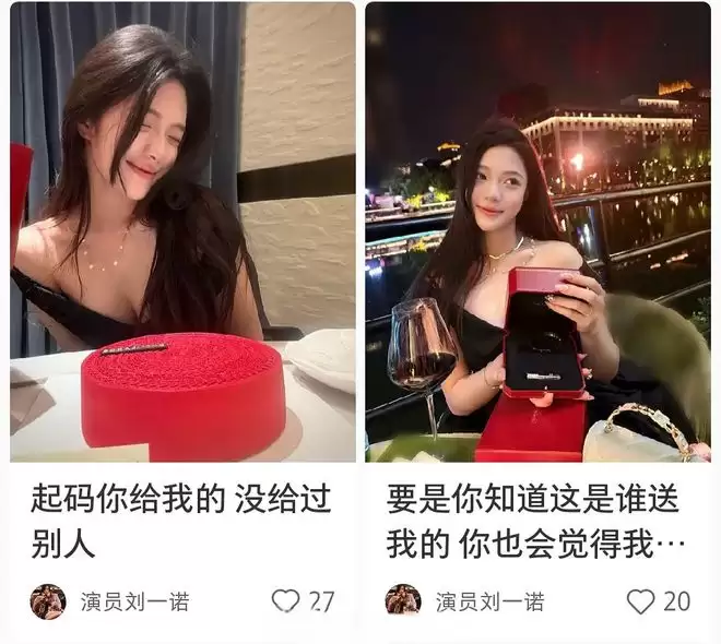 1月4日,一个叫刘一诺的女演员在微博更新了晒卡地亚的内 容,文案为:“你送我的礼物,我不想你也送给过别人。”