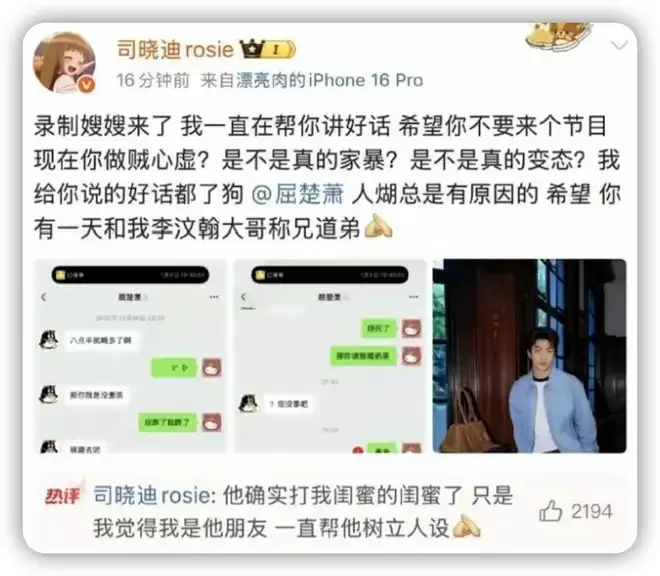 因为司晓迪加码爆料屈楚萧打了自己闺蜜的闺蜜;