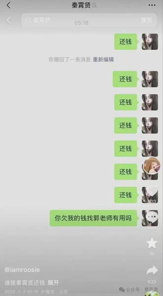 她也一直跟秦霄贤发“还钱”的信息,看起来秦霄贤还欠司晓迪不少钱。
