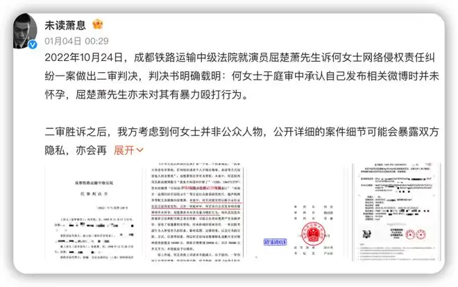 塌成废墟的屈楚萧在1月4日凌晨说自己打了个官司打赢了,在跟何女士关系中没有暴力殴打行为。
