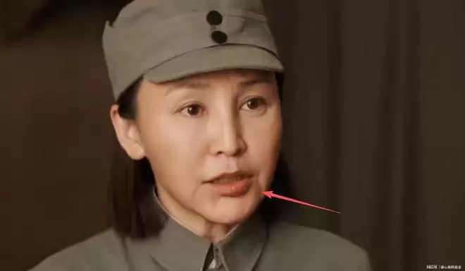 她的脸部能明显看出过度医美后的僵硬感,苹果肌突兀、脸颊线条不自然,和战时女兵该有的质朴神态格格不入。