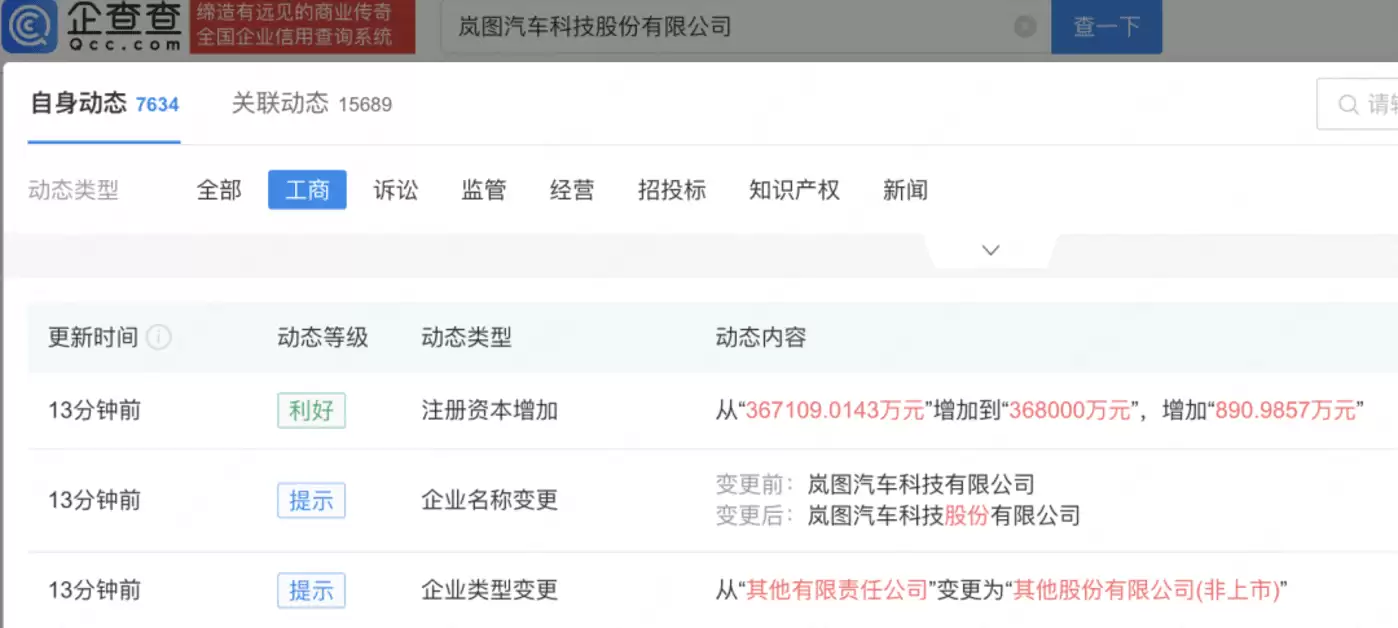 图/岚图汽车注册资本增加至36.8亿元 来源/企查查