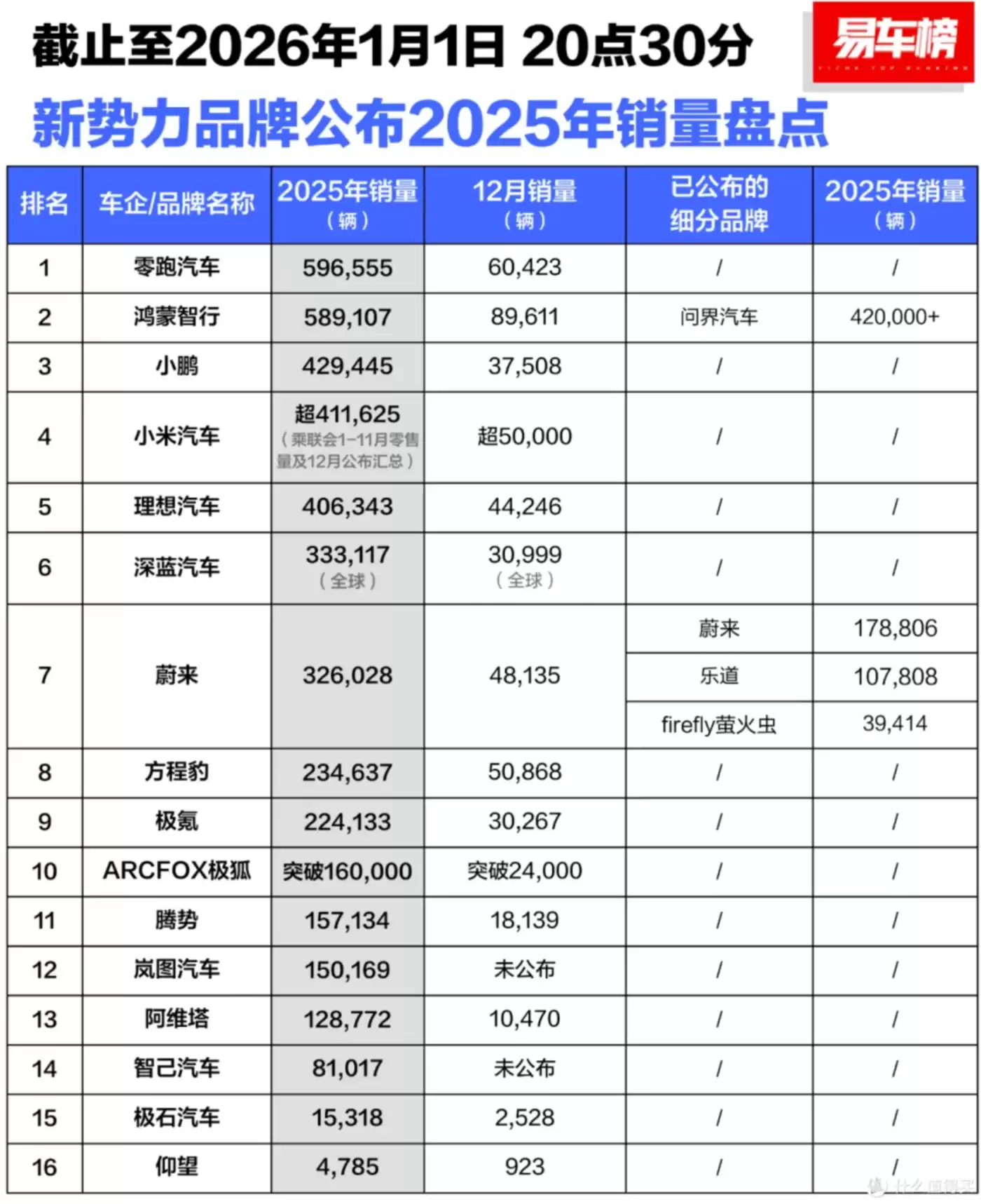 图/2025年新势力销量盘点 来源/易车 新能源观截图