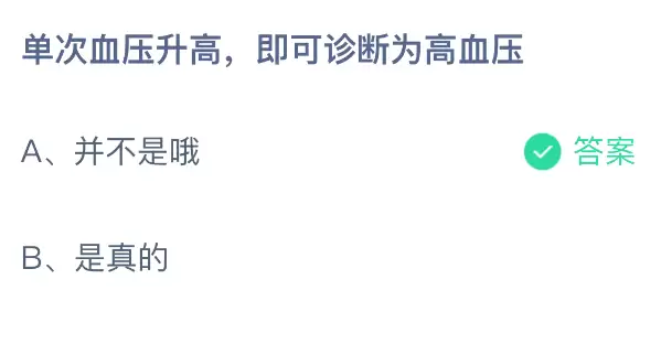 血压偶尔升高一次,就能马上被诊断为高血压吗?支付宝上的蚂蚁庄园小课堂又开课啦!每天只需花一分钟参与答题,就能免费赢取饲料,喂喂小鸡的同时还能贡献爱心,轻松又充满意义!2026年1月8日蚂蚁庄园今日题目的正确答案是【并不是哦】。单次测量发现血压升高,并不能立刻确诊为高血压。诊断高血压的标准,通常需要在非同一日的不同时间进行至少3次血压测量,结果均≥140/90mmHg,才能最终诊断为高血压。