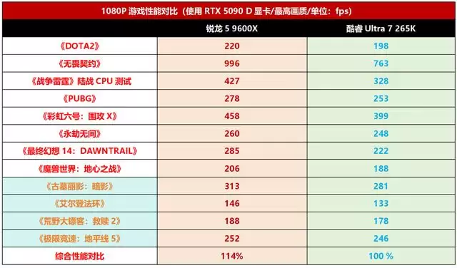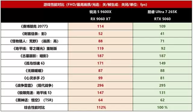 当然,不是每个买主流U的玩家都会使用RTX 5090 D这样的旗舰显卡,主流游戏装机大家更倾向于A+A、I+N 的中端组合,所以我们这里也选用锐龙5 9600X + RX 9060 XT 8GB与酷睿Ultra 7 265K + RTX 5060的组合进行了对比,看看玩家关注的实际配置下,两者有何差异。从实测结果来看,也是锐龙5 9600X + RX 9060 XT更有优势,综合所有游戏的成绩来看,平均领先酷睿Ultra 7 265K + RTX 5060的幅度达到了12%,也差不多领先了一个档次。