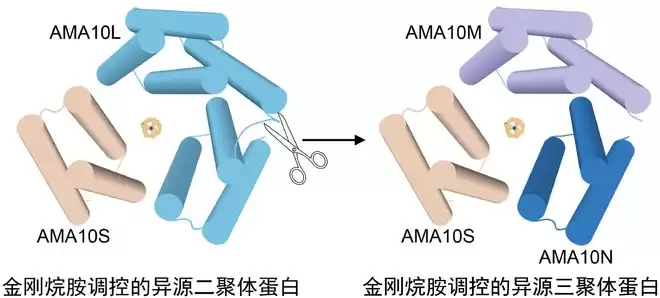 经过反复优化,研究团队成功研发出“双金刚烷胺诱导三聚体”蛋白dAIT17,其结构与设计模型高度吻合,在药物诱导下可形成稳定三聚体。在此基础上,团队进一步优化得到更灵敏的蛋白质dAIT17s,并创新开发出异源二聚体系统和异源三聚体——也就是让两个或三个不同的蛋白质“组队”,实现对不同类型蛋白质的精准组团调控。