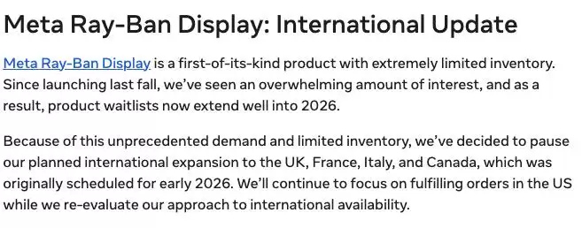 在周二发布的官方公告中,Meta指出,自Meta Ray-Ban Display于去年秋季上市以来,市场反响异常热烈,实际需求远超预期。目前产品的等候名单已经排到了2026年之后的较晚时段。鉴于这种前所未有的需求压力以及有限的产能,公司决定暂停原计划于2026年初在包括英国、法国、意大利和加拿大在内的国际市场进行扩张。