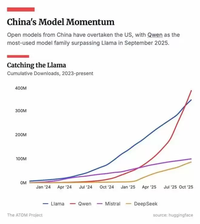 Hugging Face监测数据显示,中国开源模型的全球下载量份额首次反超美国,其中阿里巴巴的千问系列长期蝉联榜首