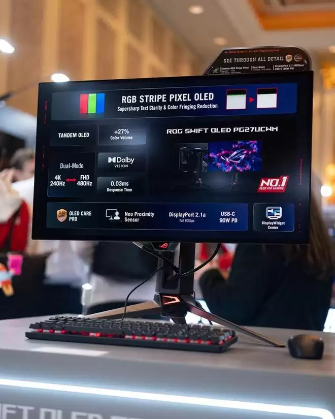 作为本届CES2026展会上的核心亮点之一,ROG推出的全新OLED电竞显示器ROG超神27二代,在技术方面做出了全新飞跃。它采用26.5英寸的主流尺寸设计,搭载了真RGB条状OLED技术与串联式TandemOLED面板。前者去掉了传统WOLED面板中的白色子像素,采用真RGB条状OLED技术,色域容积提升高达27%,尤其在高亮度环境下,为玩家呈现更丰富、更鲜活的色彩表现。并且能够提供非常锐利清晰的文字,减少彩边干扰,方便玩家观看;后者则全方位提升了屏幕的性能。搭配Neo接近传感器,自动识别玩家与屏幕间的距离,自动切换黑屏或恢复原始桌面画面,以防止OLED面板烙印,贴心保护屏幕。